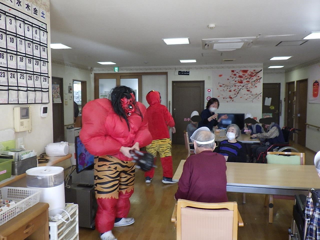 今月は節分会を行いまして、スタッフが鬼の格好になられ、利用者皆さまは、勢い良く豆を鬼の方へ向かって、まいてくださり楽しまれておりました。