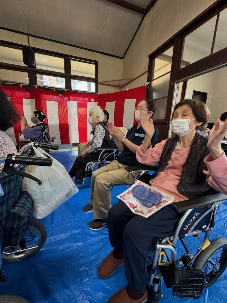 皆様お元気で身体能力も高齢者とは思えないくらい 高かったです。知っている歌は一緒に歌ったり、できるところは一緒に手足を動かしたりしました。 「面白かったね。」と満足感に溢れていました。