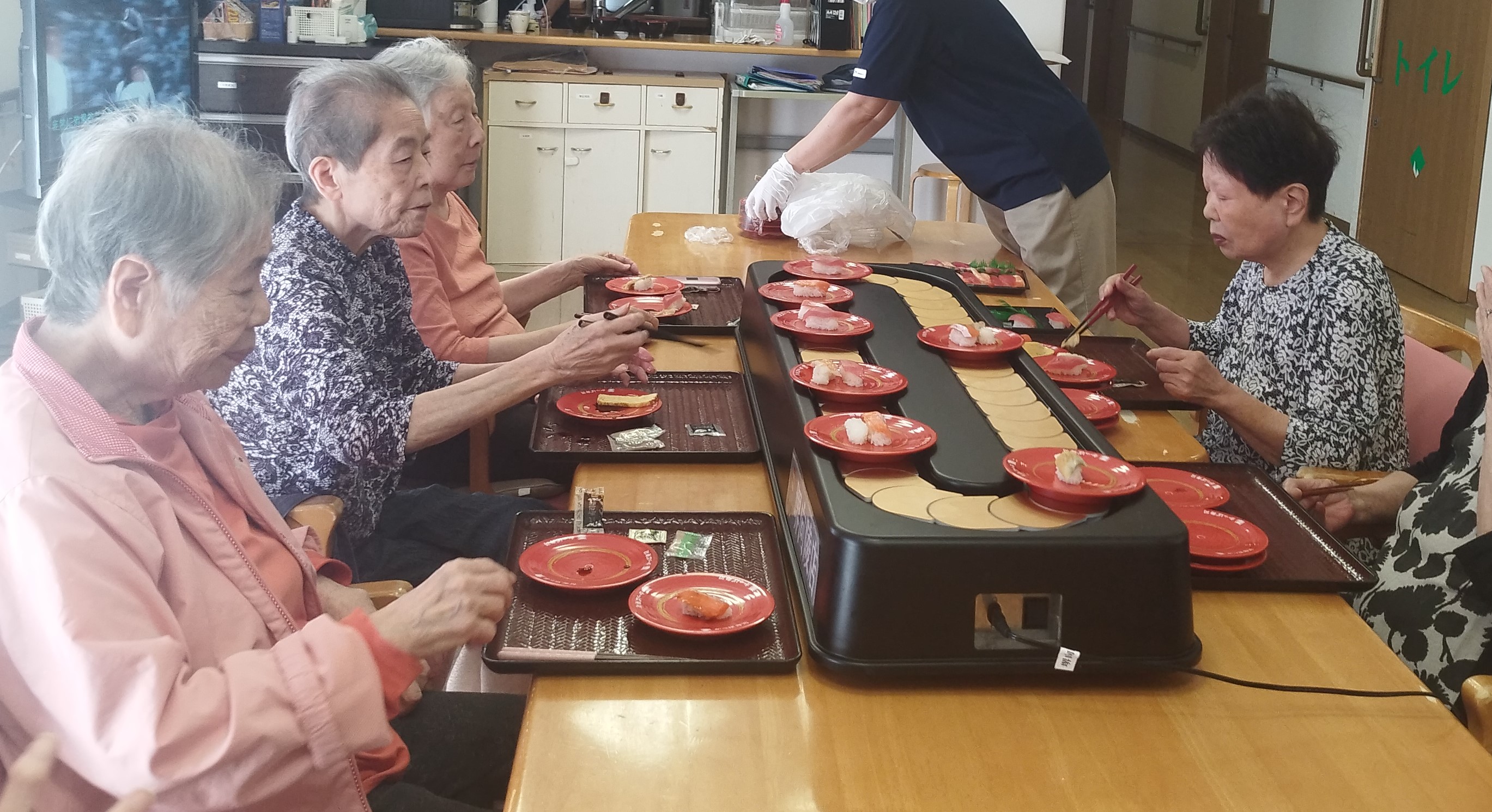 入居者様の誕生日に回転すしのレーンを借りて、