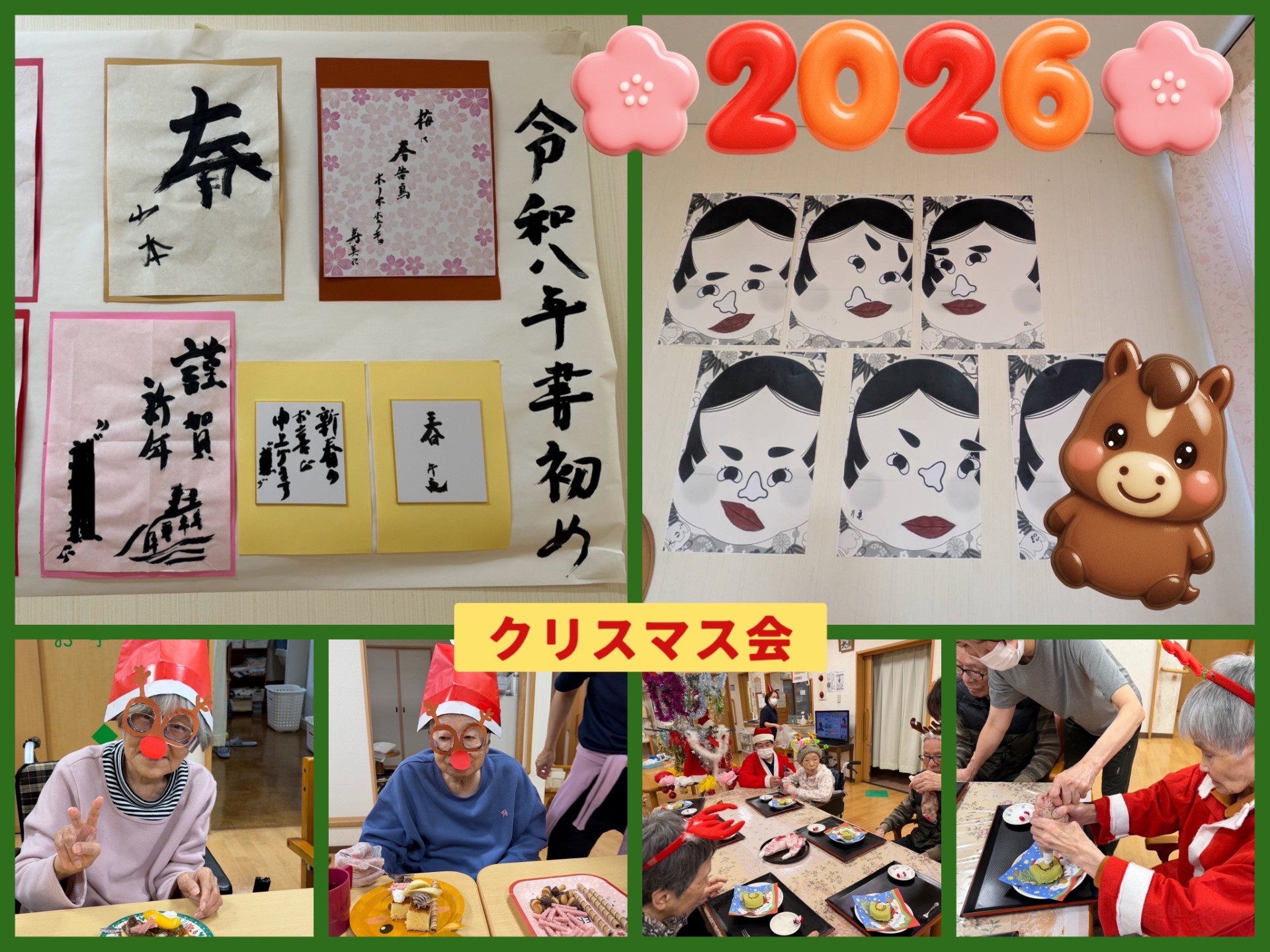 昨年末のクリスマス会ではお一人お一人でケーキにトッピングなどを楽しみ、新年は書初めや福笑いなどの正月遊びで賑やかに幕を開けました。