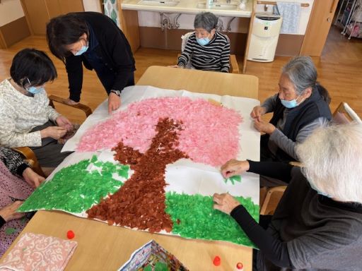 今月は大きな桜の木の壁画を皆さんで作って頂きました。