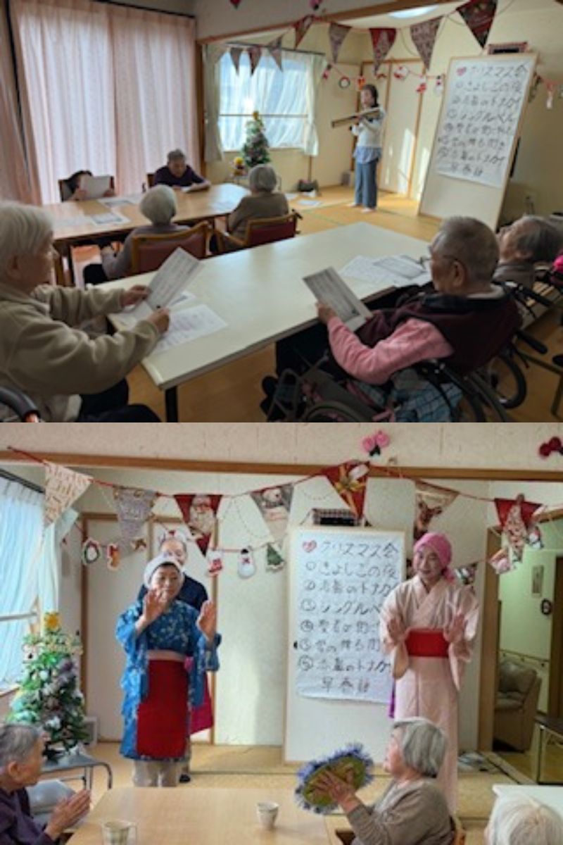 ニチイケアセンター鳥栖ではクリスマス会を実施いたしました。ボランティアさんによるハーモニカと鍵盤ハーモニカの演奏では、歌詞カードを見ながら一緒に歌われたり、手拍子などで参加されました。また職員による踊りでは一緒に炭坑節を踊られたりして、楽しい時間を過ごしました。「よかったよ、楽しかった」「お正月も楽しみにしとるよ」等など、各々感想を話されました。