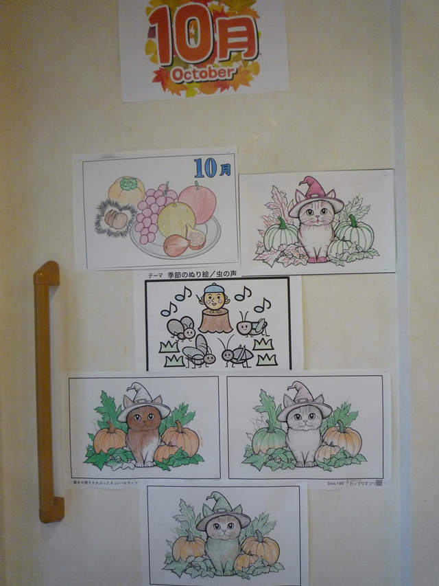 11月には、ニチイまつりを実施する予定です。これからみなさんと招待状を作ります。たくさんの方のご来場をお待ちしております。玄関では、秋らしいぬり絵がお迎えします。