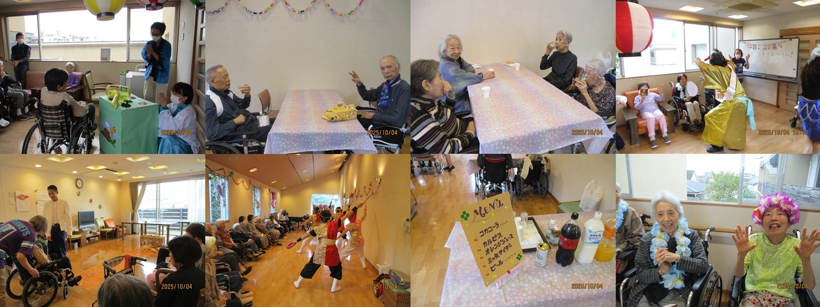 2025/11/05 更新 10月最初の土曜日、年に一度の祭典・ニチイ祭りが 行われました! 各フロアでの出し物では笑いつつも真剣にミニゲームに挑まれています。 地域交流ホールでの喫茶室ではノンアルコールビールで 一杯♪ ボランティアの方たちによるエイサー演舞は大盛況! そしてその演舞の合間にはマ〇ケン現る!? 載せきれませんでしたが、恒例の活花レクやコンサートもあり、てんこもりな10月のイベントでした。