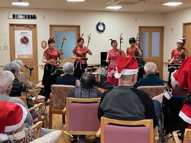 2025/12/29 更新 12月25日のクリスマス会に、ボランティアの方にお越しいただき、二胡の演奏を披露していただきました。 二胡のやさしく深みのある音色が施設内を響き渡り、利用者様も静かに耳を傾けながら、心穏やかな時間を過ごされました。演奏後には盛大な拍手とともにアンコールの声も聞こえ、笑顔あふれるひとときとなりました。 このような素敵な時間を届けてくださったボランティアの皆様に、心より感謝申し上げます。