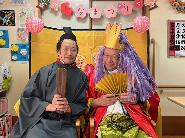 ひな祭り週間~♪利用者様に、男性は「お内裏様」女性は「お雛様」になって頂きました!最初は遠慮や恥ずかしさが見られるも、写真を撮り始めると素敵な笑顔でパシャりと撮らせてくれました。ひな祭りは古代中国の災いや穢れを払う行事が由来との事、皆様の笑顔溢れる写真撮影で「邪気」も裸足で逃げ出すようでした。