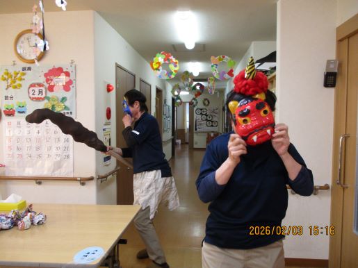 皆様、今年に入ってもう1か月が過ぎましたが、いかがお過ごしでしょうか。寒さが厳しい日々が続いておりますが、皆様にはお元気にお過ごし頂いておりますことを心よりお祈り申し上げます。2月に入り、寒さも一層厳しく感じられますが、暖かい施設内でご利用者様と、色々なレクリエーションやアクティビティを通じて、共に楽しい時間を過ごせる事が、私たち職員にとって何よりの喜びとなっています。特に毎年恒例となっております豆まきは2月の一大イベントになっています。ご利用者様に思う存分、鬼退治していただいております。これからも、様々なイベントを企画し、ご利用者様に楽しんでお過ごしいただけたらと思います。
