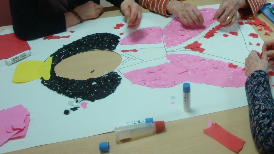 2026/03/23 更新 お内裏様とお雛様になって頂くため、貼り絵で顔ハメパネルを作成しました。紙をちぎったり貼り付けたりする作業は指先を使うので脳の活性化につながりとても良いです。
