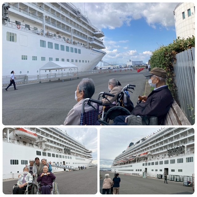 10月に入りやっと秋の気配がやってきたように思えば、寒さも徐々に増し、冬の訪れを感じます。10/21(火)、27日(月)に豪華客船の「飛鳥Ⅱ」が来航しました。各フロアごとにお散歩がてら客船を見学にお出かけ。21日は曇っておりあいにくのお天気でしたが、お客様は客船を見るなり、大変驚かれ、「こんな船に乗ってみたいなー」とおっしゃっていました。27日は、天気にも恵まれ、すがすがしい日でした。