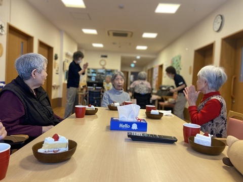 2026/03/30 更新 3月お誕生日会を皆さんで行いました。 お話ししたり、ケーキを食べたり楽しいひと時を 過ごしました。 最後に、ハッピーバースデーを皆さんで歌って楽しくお祝い しました。