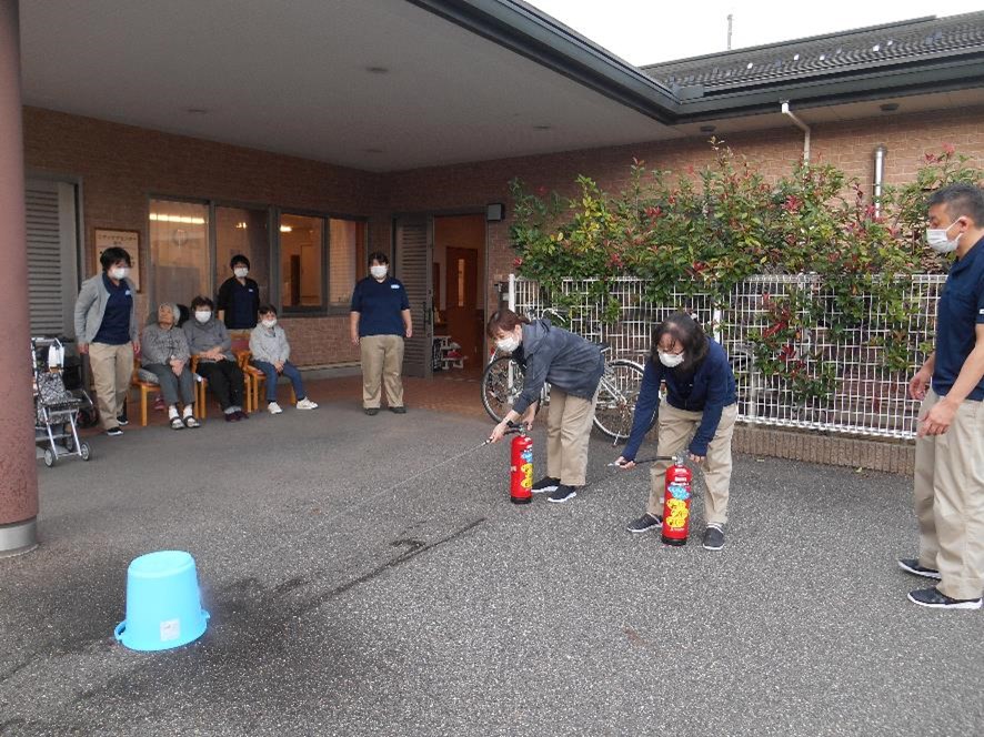 利用者様にも参加していただき、玄関先まで避難をしていただきました。スタッフの消火訓練の様子です。