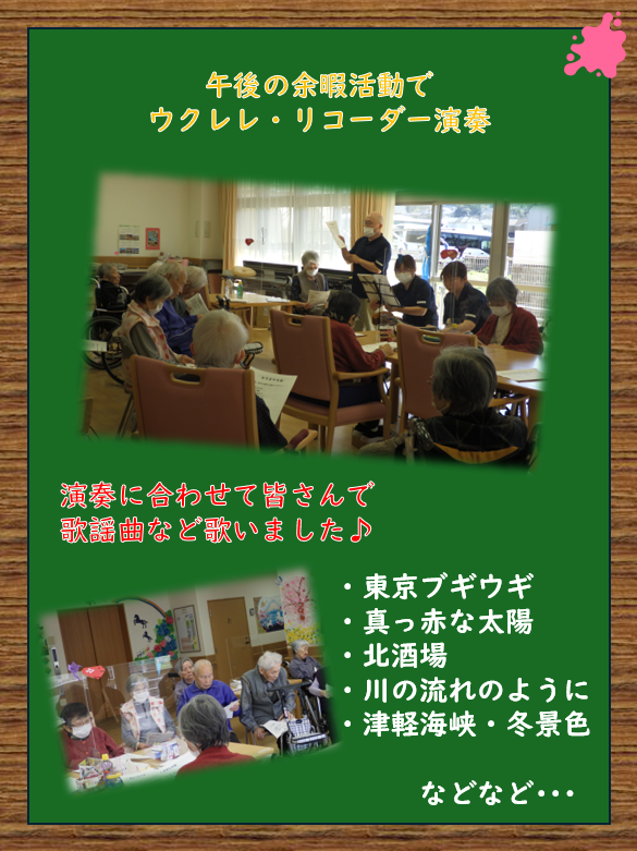 他にも日々体操行ったり、敷地内の花壇の芝桜を見に行ったり、塗り絵や計算問題をしたりと余暇活動がとても