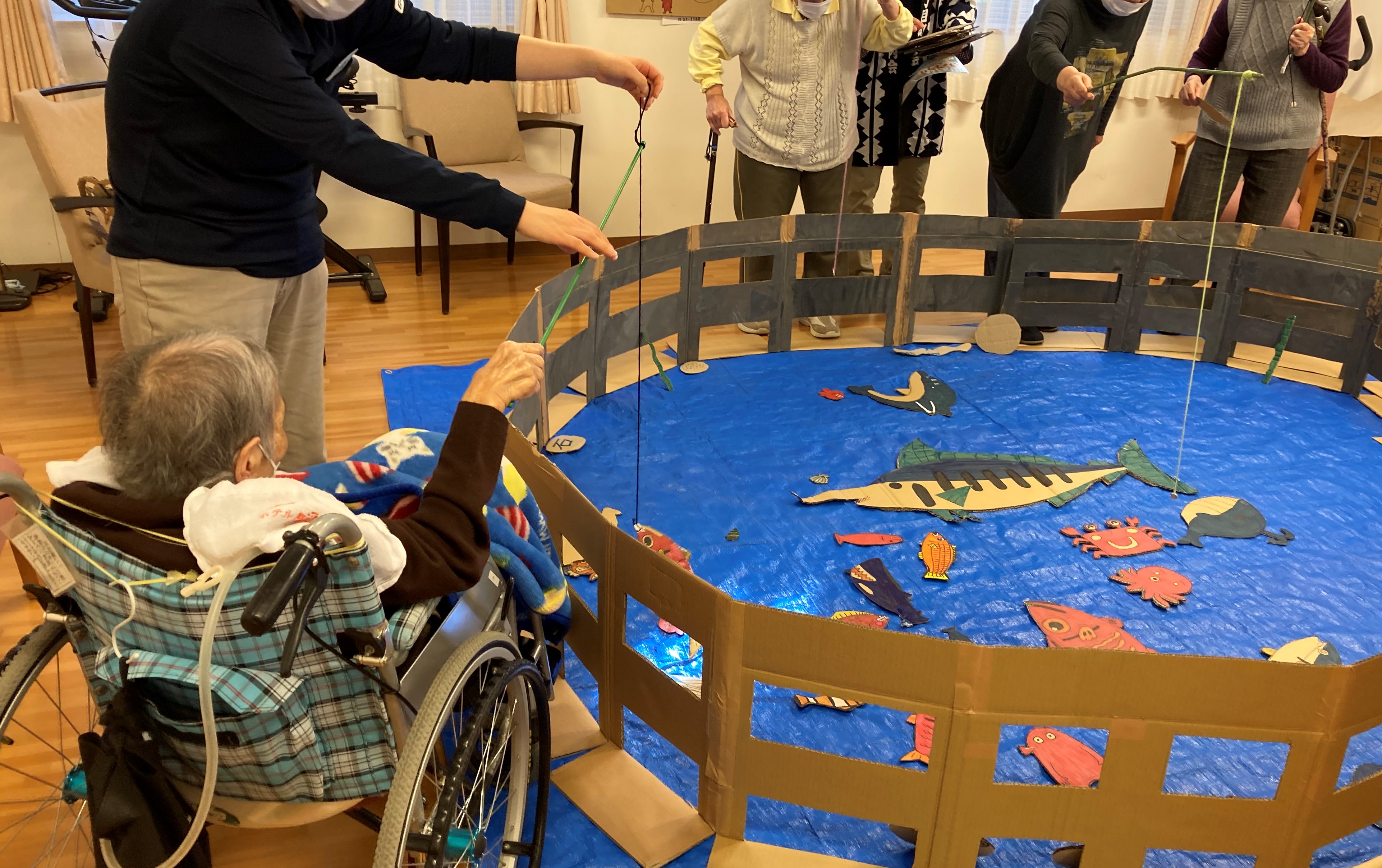 当日はお天気にも恵まれ、広い施設内全体を使ったスタンプラリーとして、魚釣り、豆つかみ、輪投げ等、運動機能訓練も兼ねたゲームを行い、皆さまに楽しんでいただきました♪