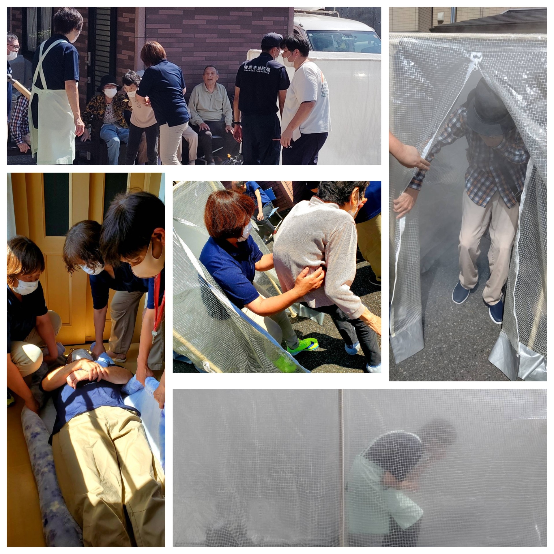 2025/09/30 更新 避難訓練 今回は、初めて 火災発生時の煙が充満しているテントの中を 実際に歩いて避難する体験をさせて頂きました。 煙で視界が遮られている中、 消防官からの説明をよく聞いて、 壁を触りながら、鼻と口を覆い 中腰でゆっくり歩いて脱出する事が出来ました。 煙って、匂いがあるんですね。 その後、スタッフによる搬送練習 毛布を使い、救出作業を練習しました。 なかなか難しいwww