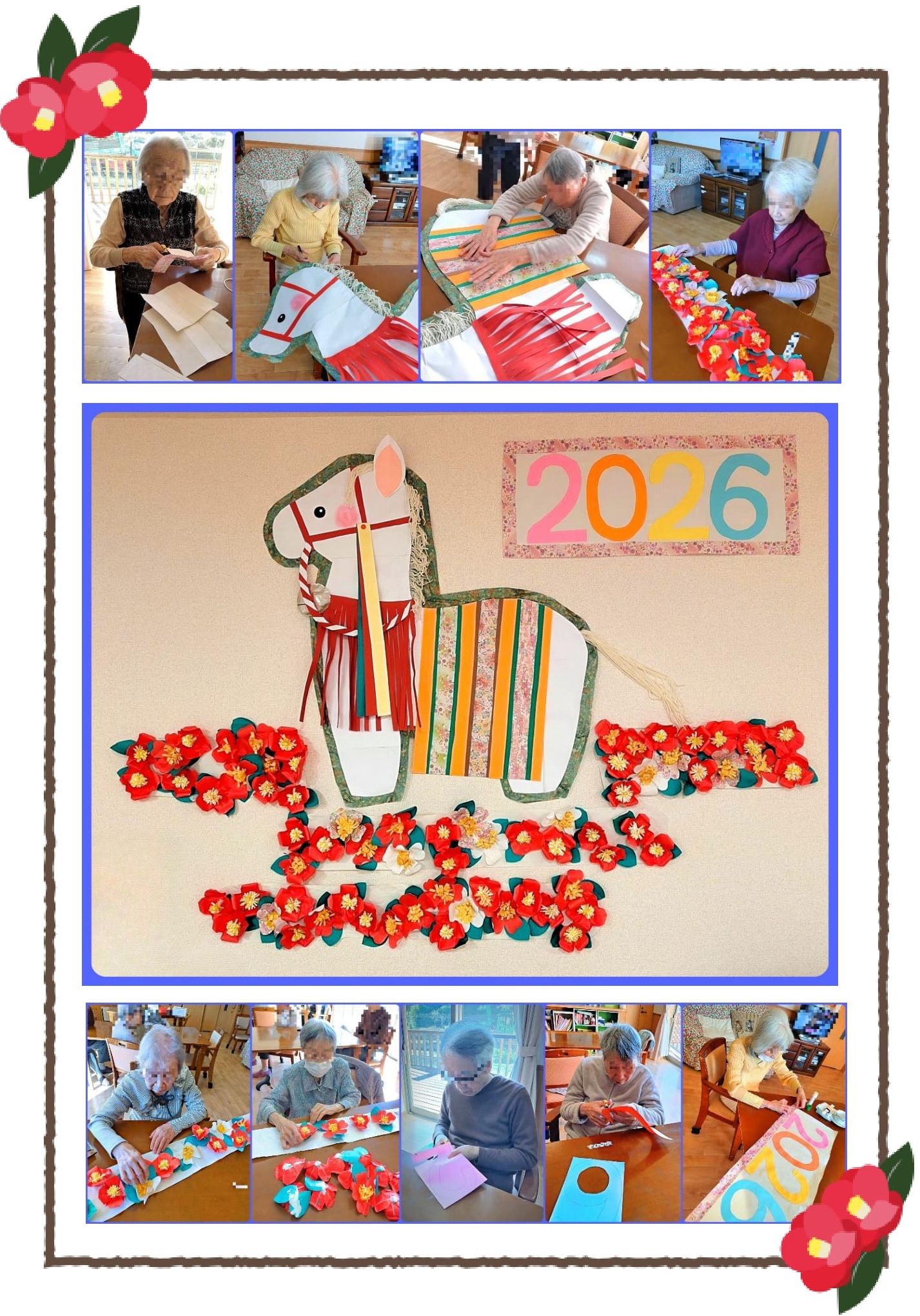 新年を明るく迎えられるように、「飾り午(馬)と、椿の花」の壁飾りです。