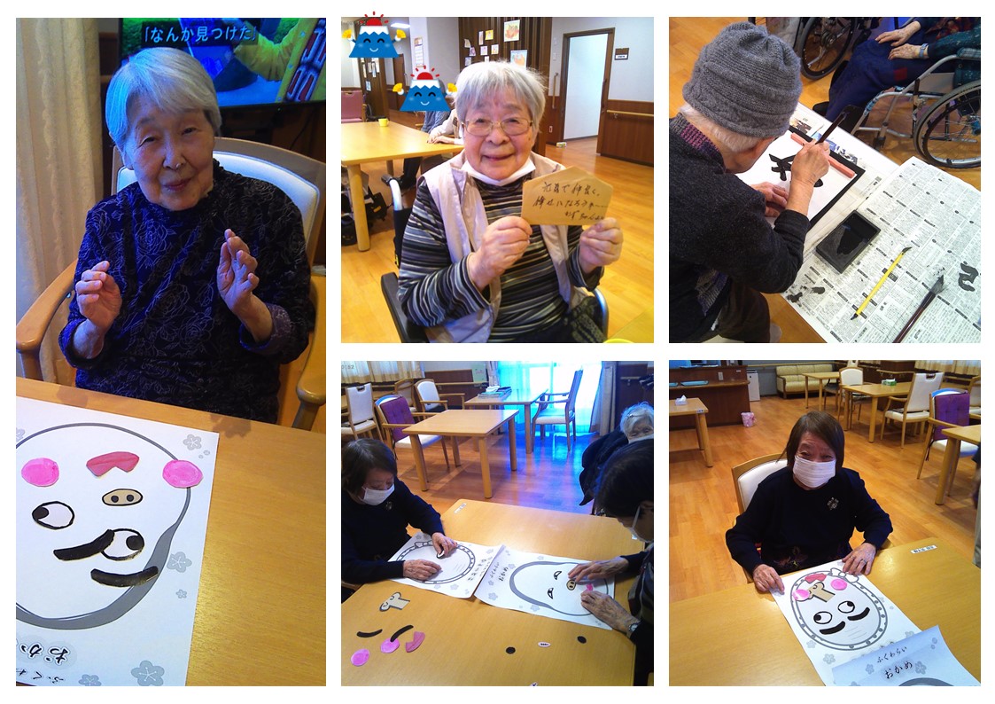 1月は福笑い、書初め、絵馬書きなど…1月といえばコレ!といったレクリエーションを用意しました。参加された皆様からステキな初笑いをいただきました(⌒∇⌒)