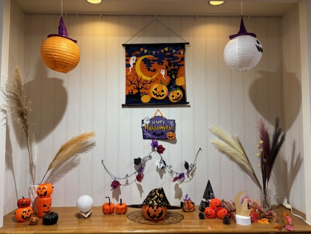 かぼちゃの提灯にかぼちゃの飾りもの。とても可愛らしい
