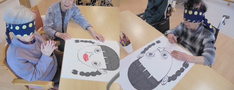 日中フロアではいつもの体操や歌や利用者さん同士のおしゃべり。そして正月ならではの福笑いなどのレクリエーションなどを楽しんでいるとあっという間に1日が暮れて行きます。