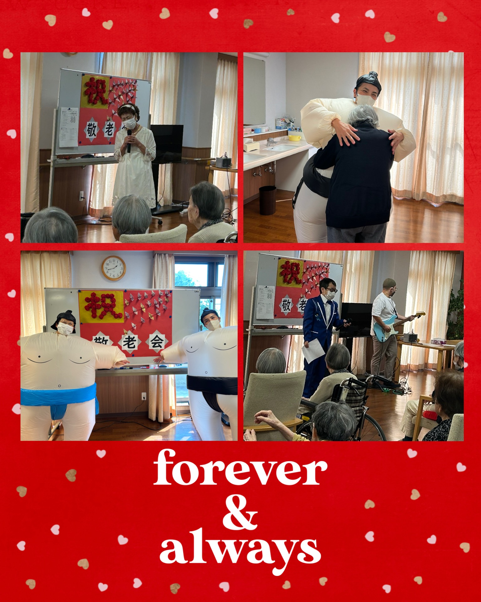 まずは介護リーダーが「学園天国」を歌って盛り上げ、