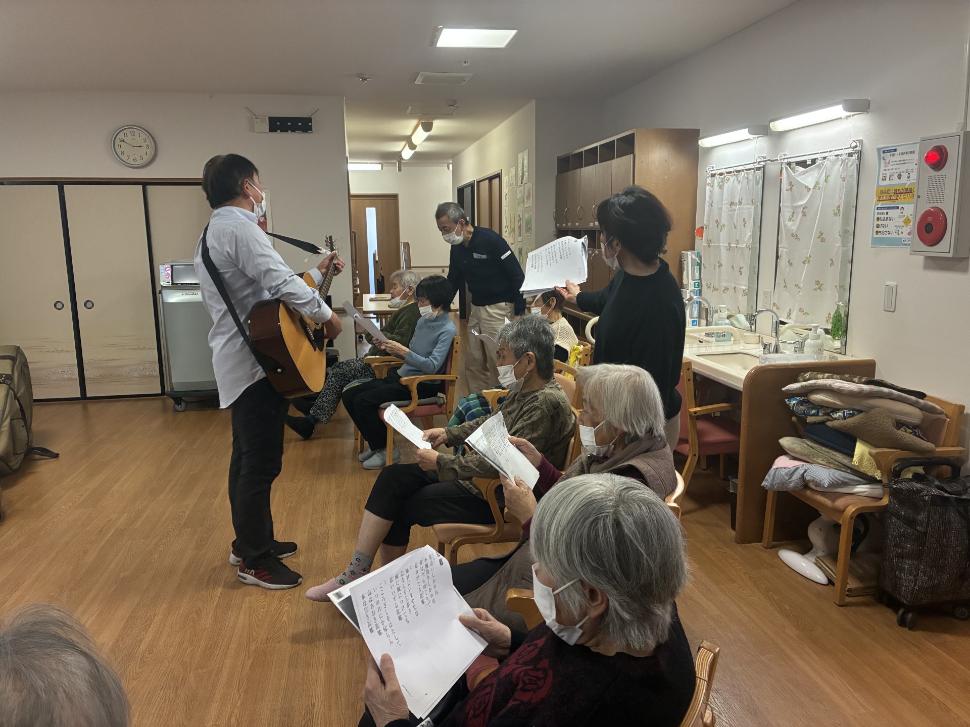 先日のレクリエーションの時間にはボランティアさんに来ていただき、ギターやピアノを弾いてもらいながら一緒に歌を歌いました♪