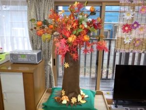 ホーム内の飾りも実りの秋を迎え、ひとつの木に紅葉、柿、栗が生っており木の下にはキノコが生えている夢のような木の飾りつけがあります。 できれば、サツマイモも欲しいところですが・・・。