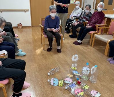 2026/02/05 更新 今年の豆まきは鬼に見立てたペットボトルにお手玉を当てるゲームを行いました。安全のため椅子に座りながらの鬼退治でしたが、しっかり鬼を払い、無病息災で過ごせそうです。 【ご案内】 施設見学を随時受け付けております。 お気軽にご連絡下さい。