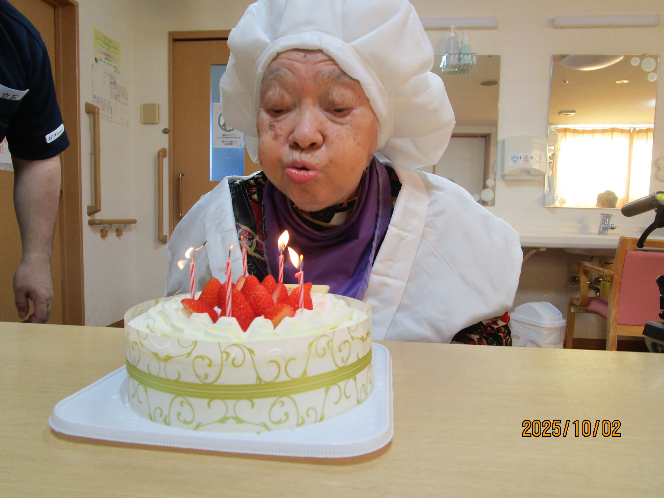 2025/10/21 更新 2025/10/05 更新 今月2日入居者さまが百寿(100歳)を迎えられました。 お祝い当日は、百寿の祝い着を身にまとい、とても華やかな雰囲気に包まれました。記念撮影後に皆で歌を贈り、ボーリングレクリエーションを楽しんだ後は記念のケーキを頂きました。