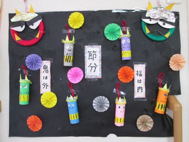 トイレットペーパーの芯と折り紙でとてもかわいらしい鬼が出来上がりました。皆様とてもきれいに折り紙を貼り付け、かわいい顔も描いて下さいました。
