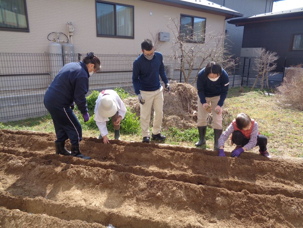 2026/03/16 更新 やっと暖かい季節となりました。 今年はホームの庭にある畑にジャガイモを栽培します。 畝3列分、お客様にも手伝っていただき、種芋の植え付けをしました。 これから、芽が出て、葉が伸び、見えない土の中では芋が すくすくと育つことでしょう。水やりや施肥など行い、お客様方と一緒にジャガイモの成長を見守っていきたいと思います。