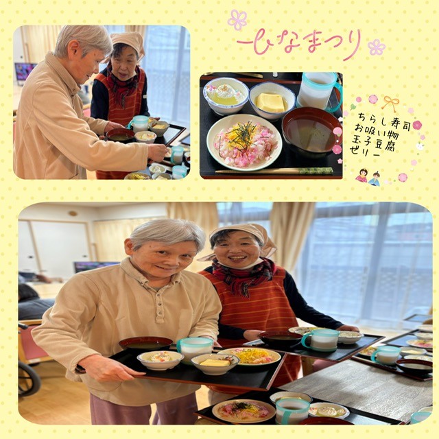 2026/03/06 更新 昼食は春色のちらし寿司です。 一緒に盛り付けをしたり、 配膳をしました。 「きれいな色だねぇ」 「このゼリー、かわいいね」等々 会話が弾みました。