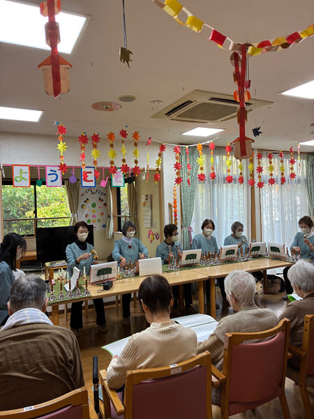 もうすぐ12月ということでクリスマスの曲を準備し、入居者の方が鳴らせるよう鈴も持ってきてくださいました。