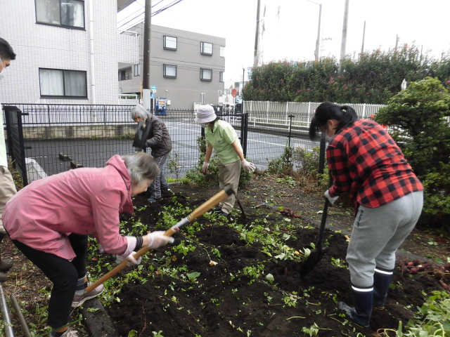 ホームの小さな畑で育てたサツマイモを、皆なで掘り起こしました。