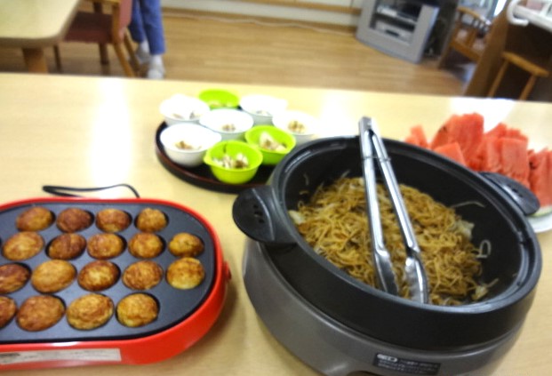 ニチイケアセンター上溝祭りを開催いたしました。屋台などお祭りの雰囲気を味わっていただくために、スタッフが手作りの提灯や手作りの多数の風鈴などを飾り付けてくれました。提灯や風鈴の下で焼きそば屋さん、たこ焼き屋さん、スイカ屋さん、チョコバナナ屋さんが並び皆様、覗き込みながら次は何食べようかな?と並んで受け取っていました。お腹が満たされたころには今度は水風船屋さんが登場しお好きな色の水風船を狙って釣りを楽しまれました。「俺もやるよ!」とねじり鉢巻きで焼きそば屋さんを手伝われる利用者さんも現れ「似合ってる」と皆様からお褒めの言葉をいただき照れ笑いする微笑ましい場面もありました。
