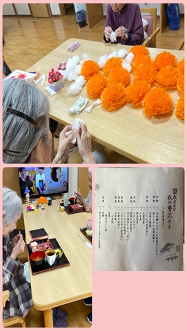 さて、今月の中盤には、ご入居の皆様と共に「お花飾り制作会」という、なんとも雅な催しを執り行いましたの。