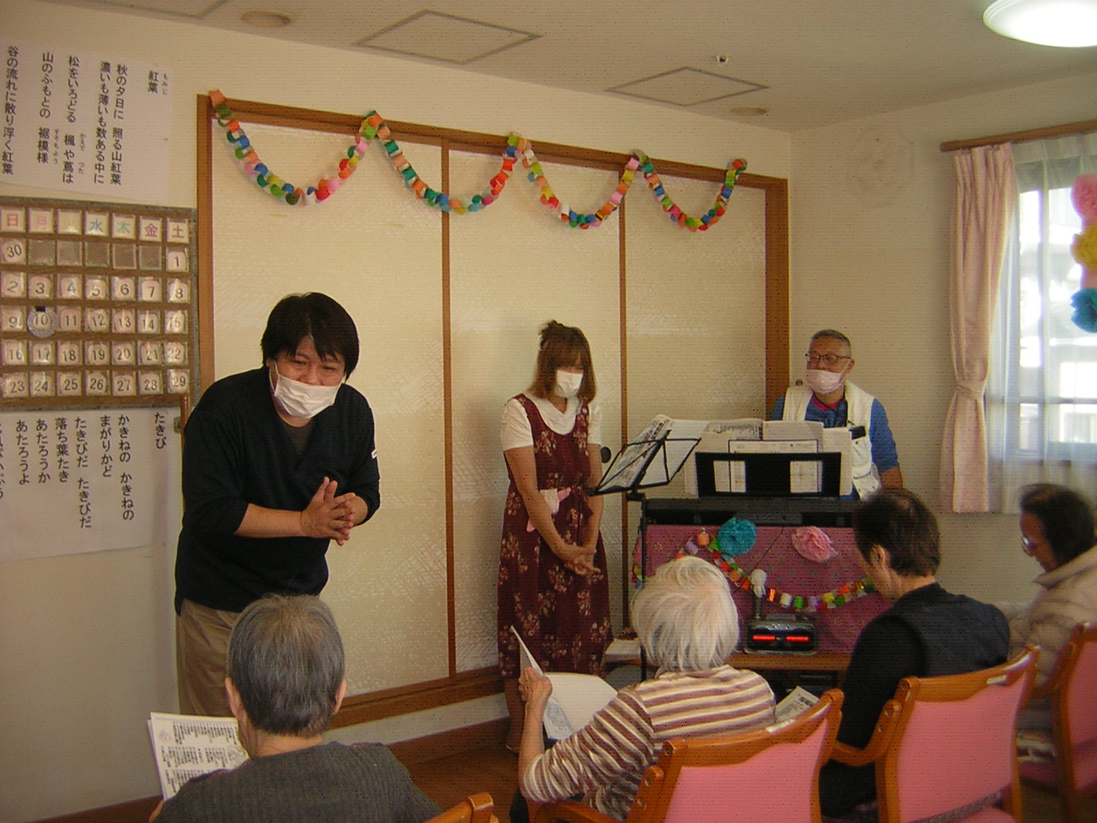 11月11日は介護の日という事で歌唱ボランティア『Lilu』さんをお招きし、歌唱大会をおこないました。ボランティアさんのピアノの伴奏に合わせ、歌謡曲などをリクエストし、唄を楽しみました。中には手で振付をしたり、踊りだす方もいて大盛り上がりでした♪