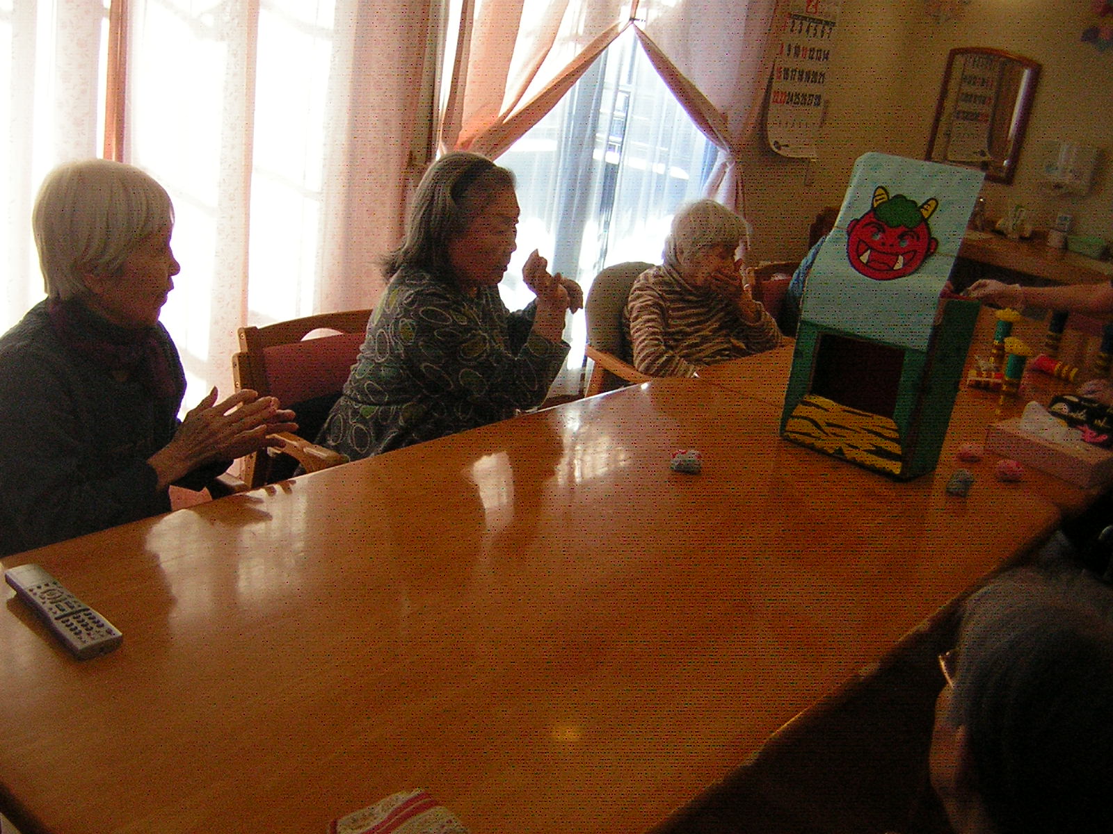 2月3日は節分ということで、鬼当てゲームを行いました。本当は穴に向かってお手玉を入れていくのですが、皆さん鬼に当てる方が楽しかったのか、鬼にばかりぶつけていました。