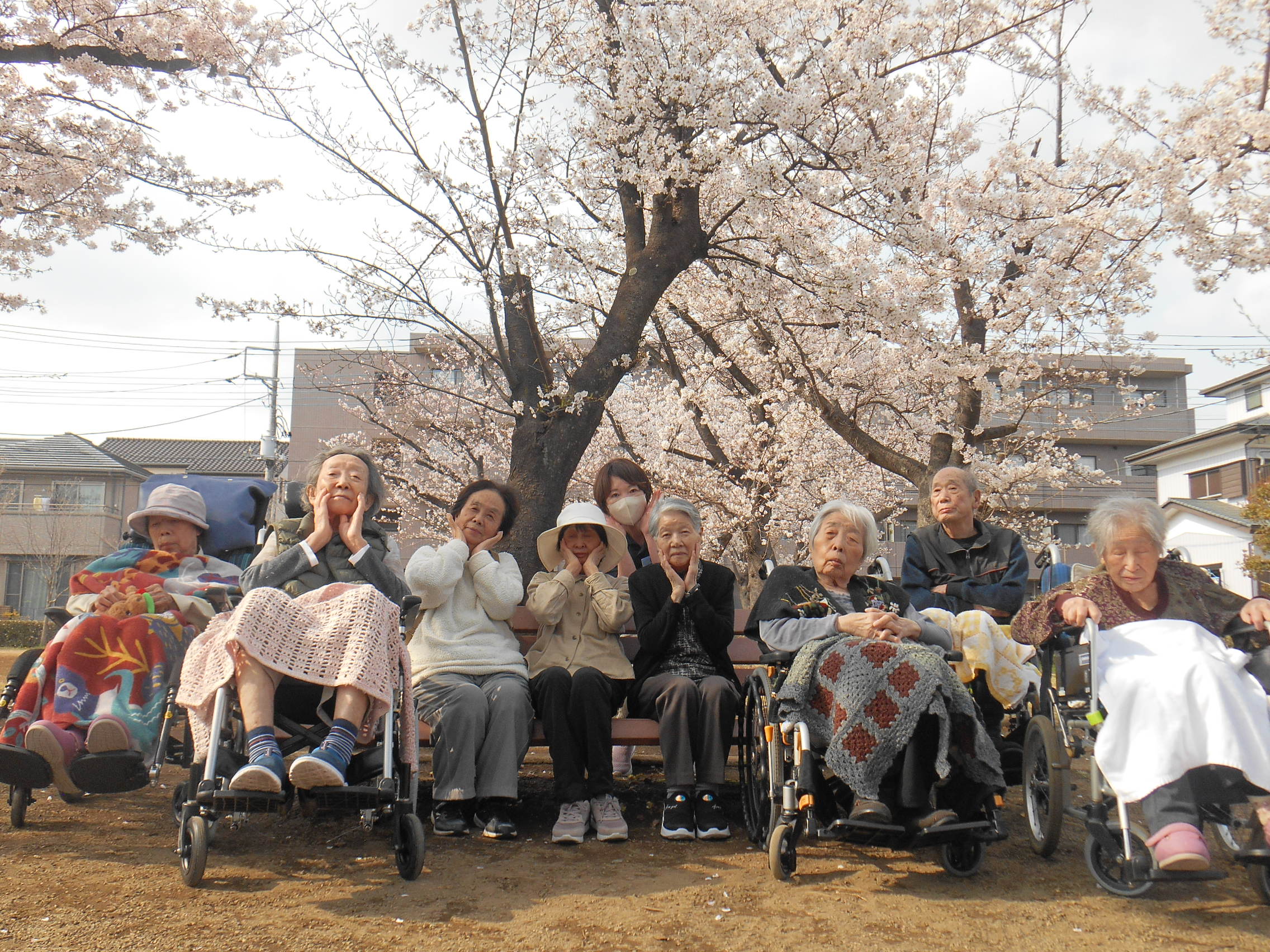 入居者様も先日天気が良かったので、おやつをもってみんなで近くの公園にお花見いきました。