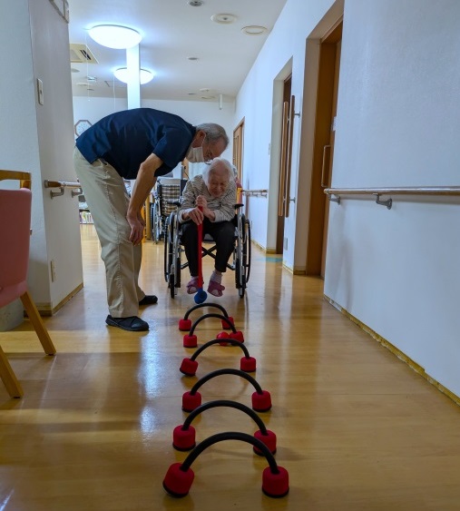 秋といえばスポーツの秋♪ミニ運動会としてホーム内の廊下にゲートボールのゲートを並べ皆さんに何個通過できるか競い合っていただきました!