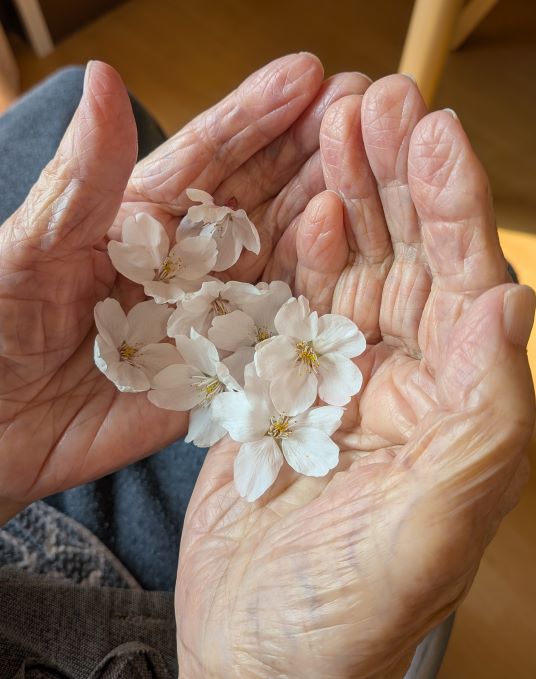 今回の写真は、近所の桜を利用者様にお見せした時の写真です。外に行くのは嫌、という方へ桜の花をお土産に♪