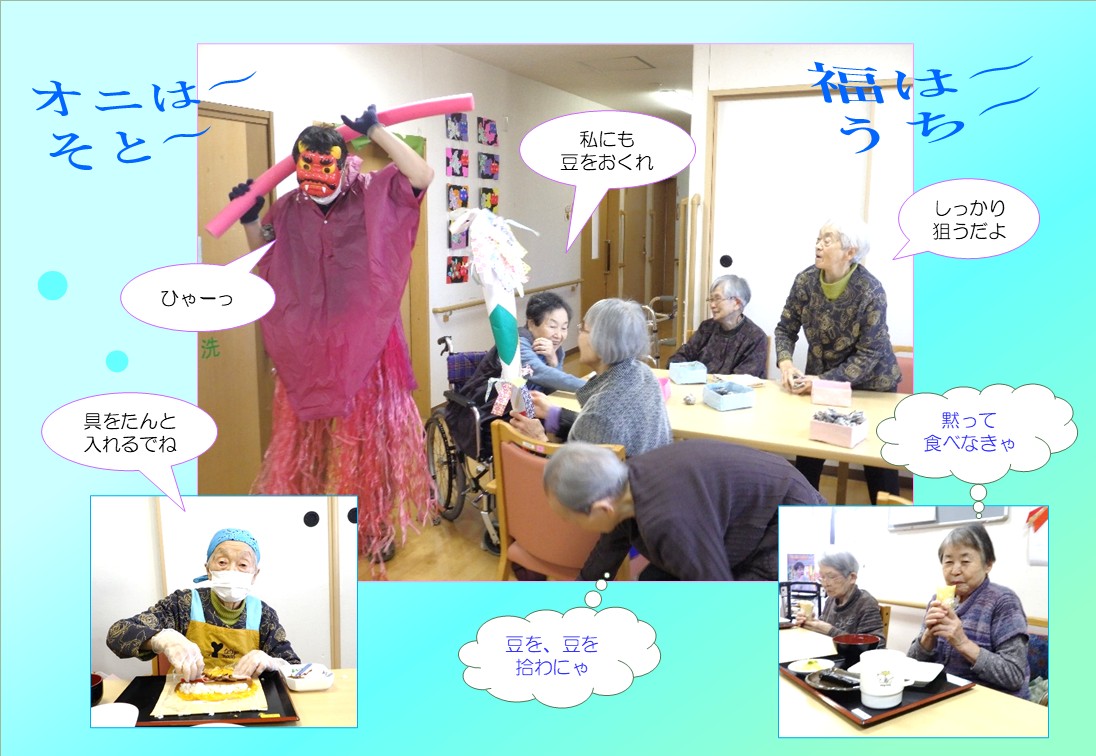 『おっかかないよ~』とか言いながら、新聞などで作った豆をつかんで勇ましく対決して下さるお母さん方でした。