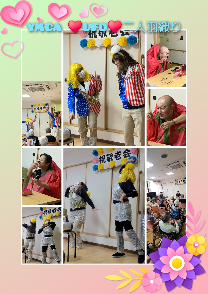 手品や踊り付のYMCAとUFOを踊りながら歌い、2人羽織を行いました。