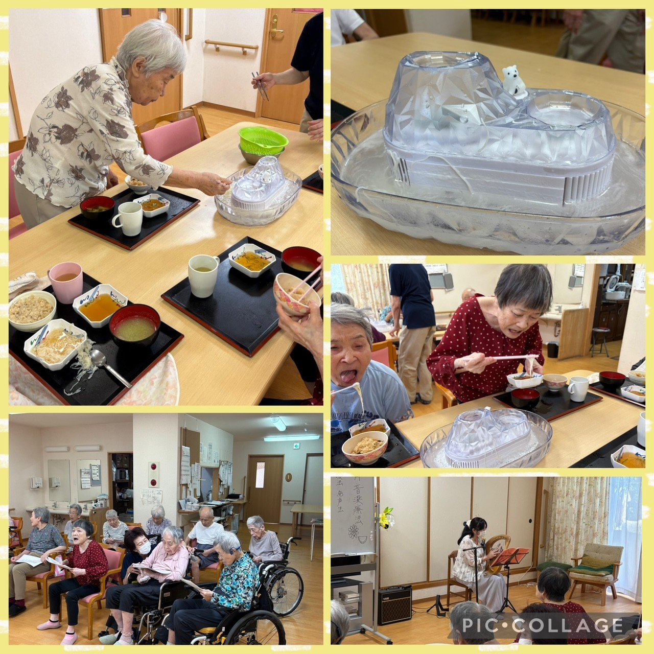 先日、少し遅めではありますが昼食に流しそうめんを楽しんでいただきました!小さめな流しそうめんの機械ではありますが皆さん楽しんでいただいた様子で用意したそうめんはあっという間に完食!流す係のスタッフはびっくりしていました。次回はもっとたくさんご用意させて頂きます。