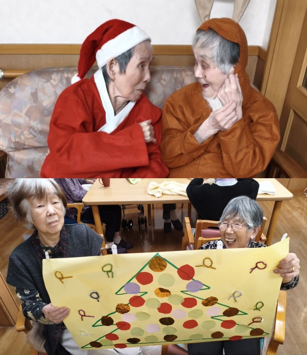 ほほえみ有玉では先日、少し早めのクリスマス会を行いました。クリスマスツリーを模した季節の掲示物を皆様で作り、美味しいケーキを召し上がり、ちょっとしたコスプレを楽しみました。サンタさんとトナカイの衣装があったので着たい人を募り、何名かに着ていただきました。
