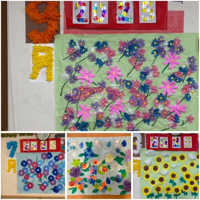 まだまだ厳しい暑さが続く毎日ですが朝夕は過ごしやすくなりました。皆様の体調やその場の環境に応じた室温に調整し脱水症を予防するため水分補給に心がけています。熱中症や脱水症を予防する暑さ対策を徹底しています。お部屋の中で出来る体操、ゲームなどのレクリエーション毎月壁画作りを楽しんでお花を咲かせています。壁画作りでお部屋の中でも季節を感じられるよう工夫しながら今月も楽しく元気パワーで過ごしていきます。手洗い、うがいを徹底しながら体調管理もしっかりと!