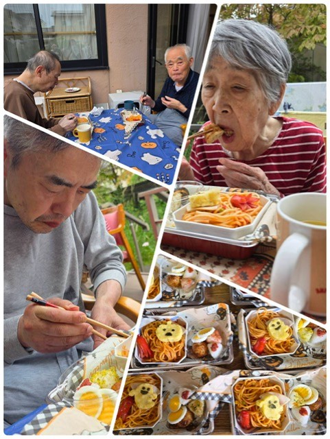 2025/11/23 更新 先日は天気の良い日にテラスに出てハロウィンパーティー風の昼食をしました。普段は室内で食べるだけですが、少し雰囲気を変えて外の風に当たりながら食事する事でいつもより少しばかりか利用者の皆様も箸が良く進んでいたように思います。