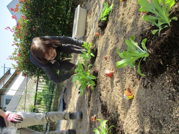畑に玉ねぎの苗を植え、花壇にはチューリップの球根を
