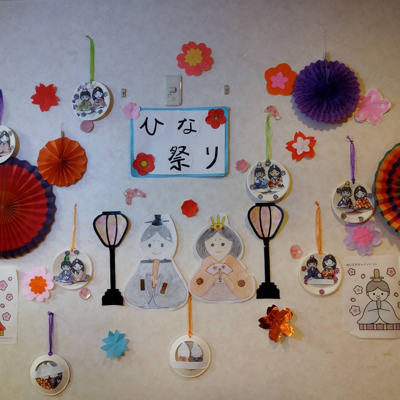 飾りの中心には、スタッフが書いたお雛様の絵に