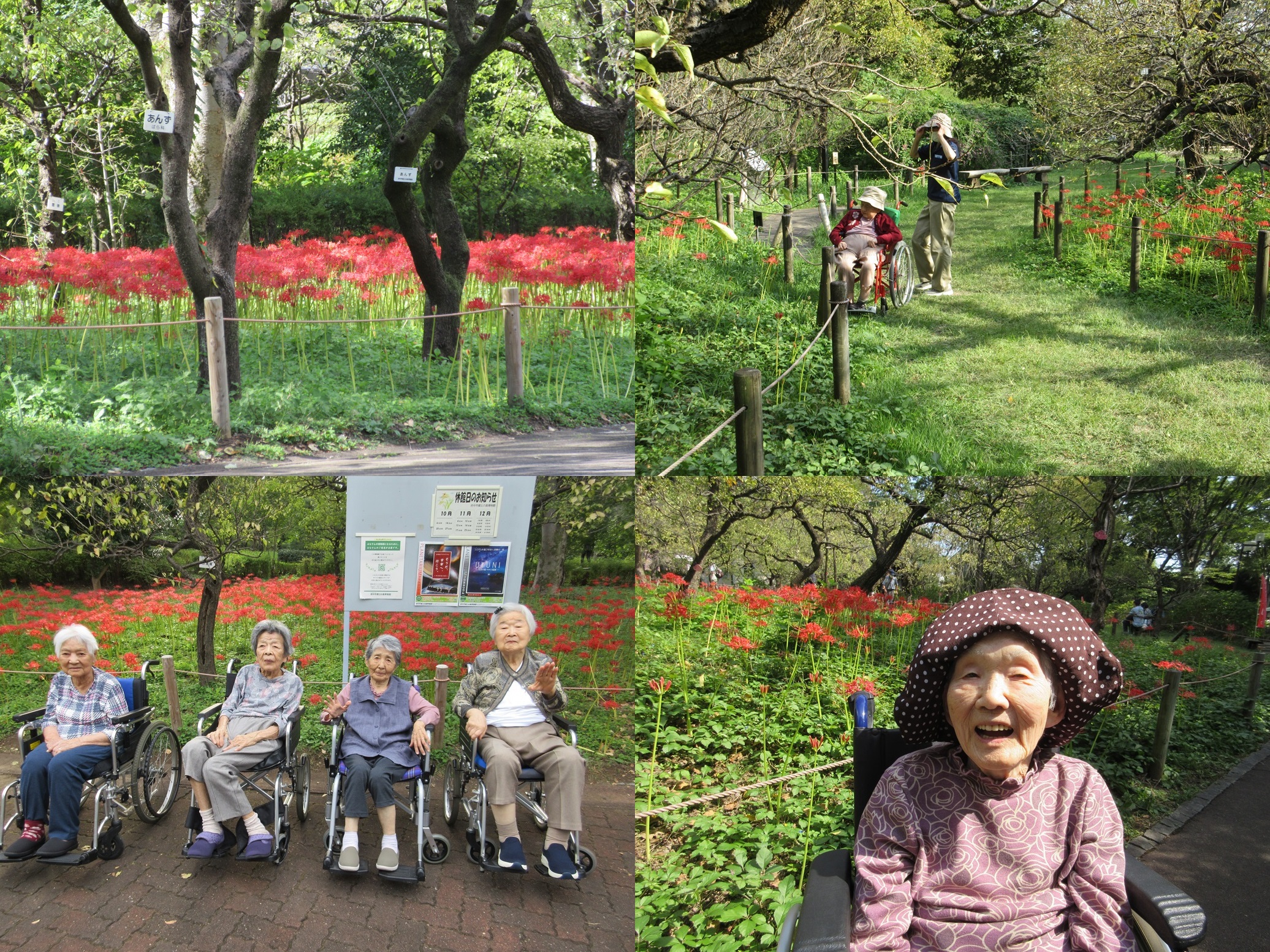 2025/10/01 更新 府中郷土の森で行われている曼殊沙華まつり。 毎年恒例の行事に今年も入居者の皆様をお連れしました。 厳しい夏を抜けてようやく散歩日和になり、 久々の外出を多くの方が喜ばれていました。 満開の彼岸花を鑑賞し、皆様心から楽しまれていたご様子です。