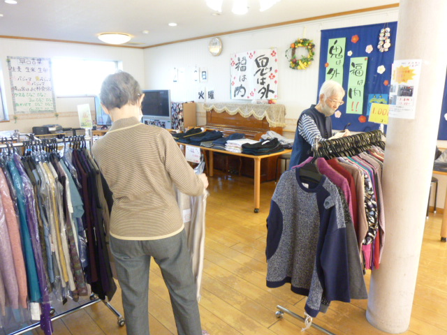 2月初め、衣料品販売「みなみニット」に来ていただきました。年4回シーズン毎にお値打ちに衣類を販売して下さいます。