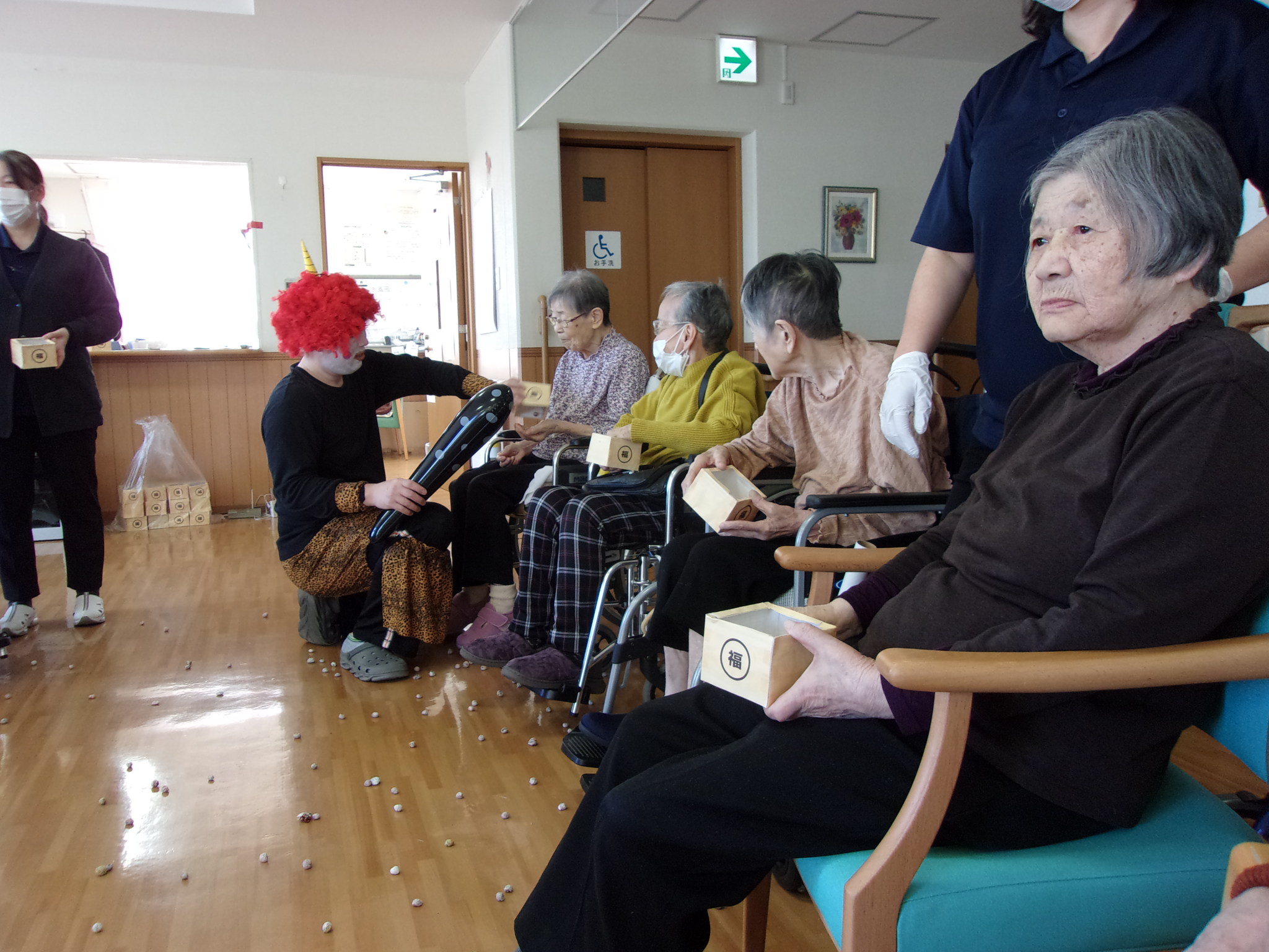 節分には豆まきが行われました。鬼役の職員が登場すると、「鬼は外、福は内」と元気な掛け声とともに、豆を投げられて和やかな雰囲気に包まれました。